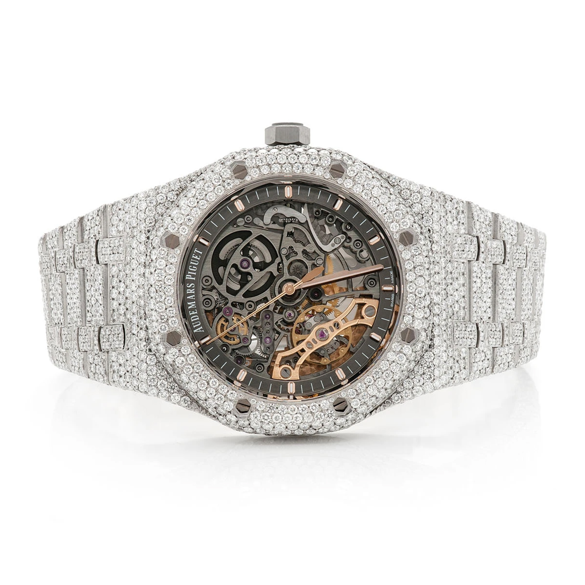 This custom Audemars Piguet features a fully iced-out design with a stunning AP Skeleton All White finish. Crafted with precision moissanite stones for exceptional brilliance. Comes with an optional premium display box.