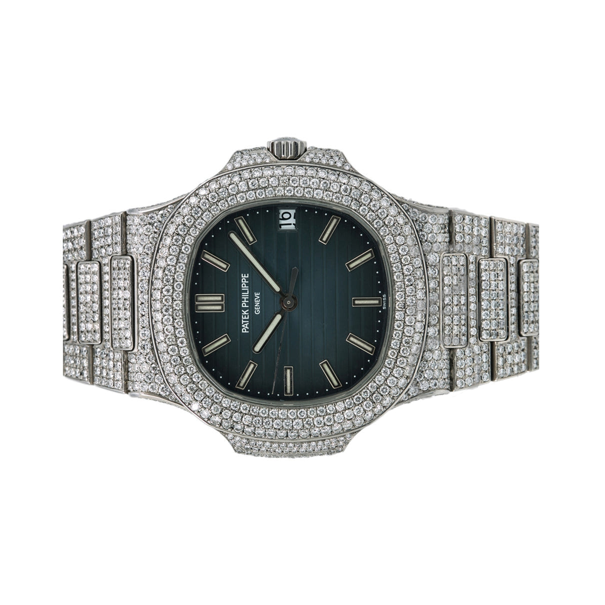 This custom Patek Philippe features a fully iced-out design with a stunning Patek Blue Dial and all white finish. Crafted with precision moissanite stones for exceptional brilliance. Comes with an optional premium display box.